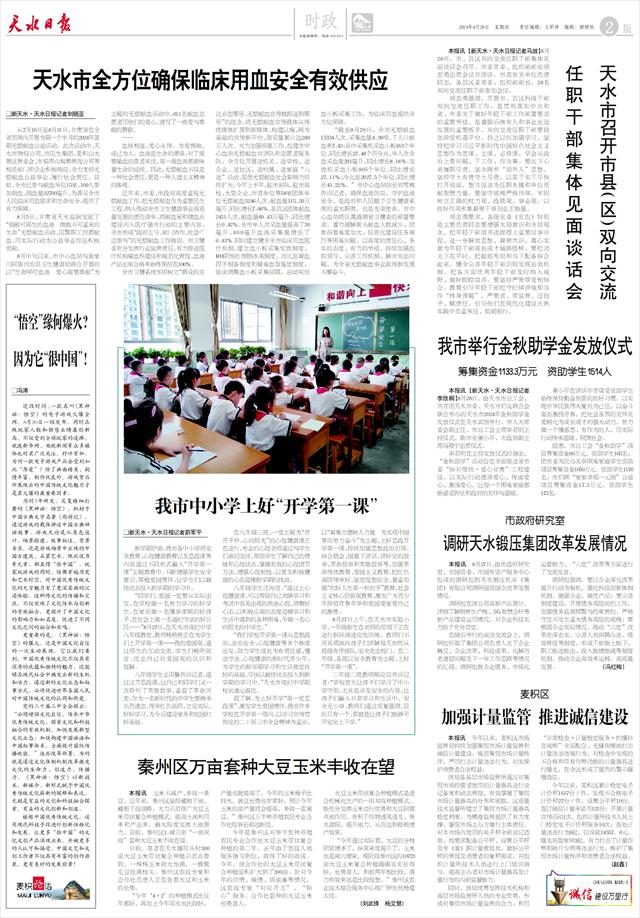 我市中小学上好“开学第一课”    新天水·天水日报记者蔚军平
