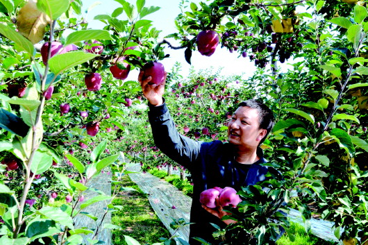 枝头果香萦绕,村民笑意盈盈。漫步南山,映入眼帘的是一望无际的绿色“海洋”,火红的苹果点缀其间,映照红火的日子。