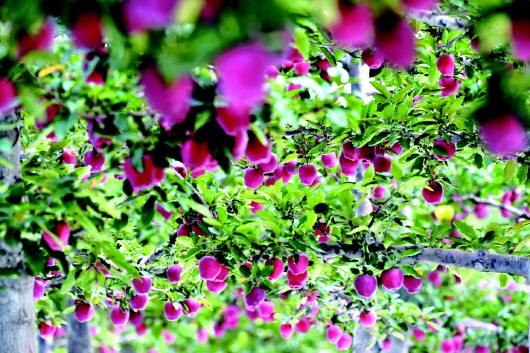 将果树控制在三到四米,枝干控制在十到十五支,并呈螺旋状分布,保证每个苹果有充足的阳光;覆盖地膜,达到抑制杂草和保持水分的双重功效;使用防霜机与滴灌技术,尽最大可能减少气候对苹果产量的影响……