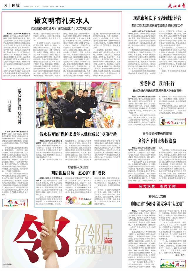 本报讯【新天水·天水日报记者蔚军平】11月7日,记者从市创城办了解到,为深入贯彻落实《甘肃省文明行为促进条例》《天水市文明行为促进条例》,推动我市创建全国文明城市工作和“五个创建”常态化长效化开展,提升全社会文明程度,近日,市创城办印发了《关于进一步常态化长效化开展做文明有礼天水人“十大文明行动”的通知》,引导广大市民从细节做起、从身边小事做起,强化文明行为习惯养成,不断提升市民整体文明素养,为全力提升全社会文明程度、加快建设社会主义现代化幸福美好新天水而共同努力。