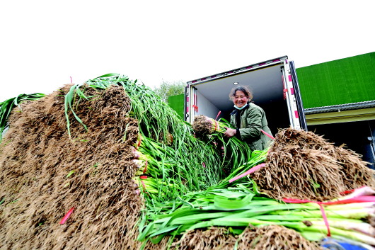 近日,武山县洛门镇郭庄村蔬菜种植基地内,农户们在装运蒜苗。