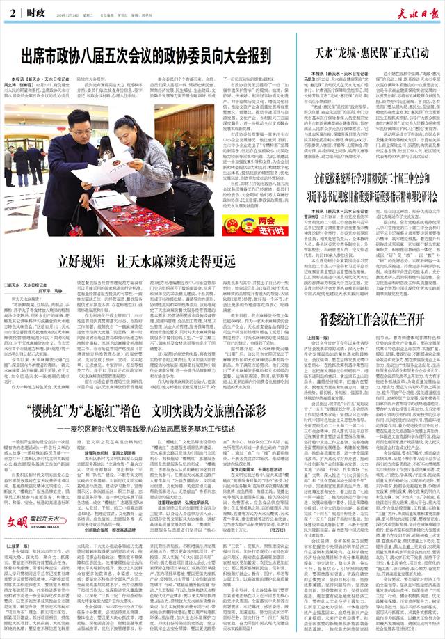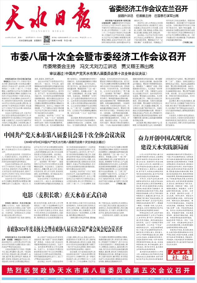 12月23日召开的市委八届十次全会暨市委经济工作会议,全面贯彻落实中央经济工作会议和省委十四届七次全会、省委经济工作会议精神,总结2024年工作,安排部署2025年全市经济社会发展主要任务。全市上下要坚定信心、乘势而上,锐意进取、苦干实干,切实把全会确定的各项目标任务落到实处,奋力开创中国式现代化建设天水实践新局面。