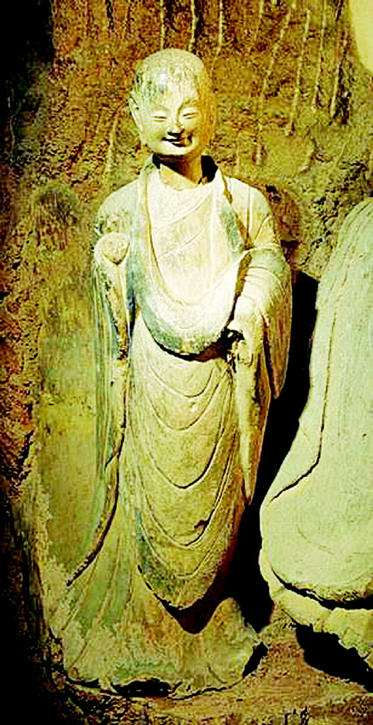 “微笑的小沙弥”年仅十多岁,眉宇间尚未脱去孩童天真无邪的稚气,脸上的喜悦和羞涩惟妙惟肖,十分逗人喜爱。其神情,俯首侧耳,似乎在专心致志地聆听佛的教诲。细眯的双眼,又好像在琢磨刚才的说教,而那深深刻印在他嘴角上的永远会心的微笑,更像是领悟了其中的奥妙,真可谓虔恭、脱俗、颖悟聪慧。我觉得其形象不仅令人难以忘怀,所展现出的独特“东方微笑”魅力,亦蕴含着深厚的文化内涵和艺术价值。