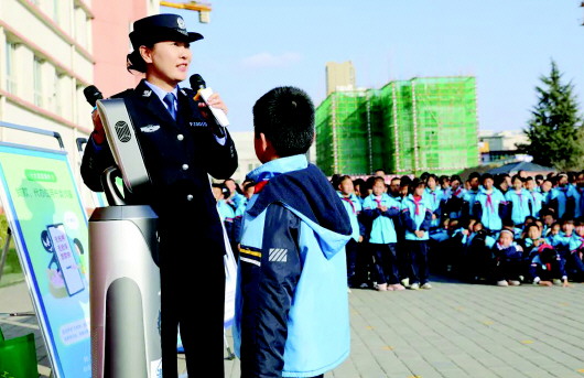 图为AI智能机器人“清清”和“帅帅”走进清水县中小学校和市集广场宣讲法律知识。