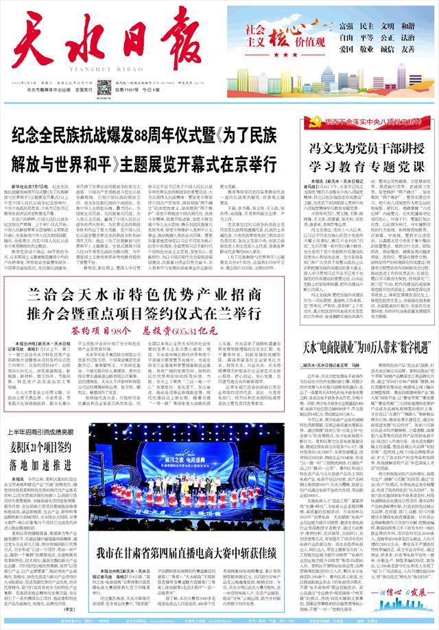 本报兰州电【新天水·天水日报记者马放 高杨】7月7日上午,第三十一届兰洽会天水市特色优势产业招商推介会暨重点项目签约仪式在兰州举行,共签约项目98个、总投资605.31亿元,涉及装备制造、新能源、新材料、数字经济、节能环保、特色农产品及食品加工等领域。