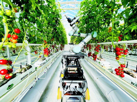 智能育种机器人“吉儿”在位于北京的一个现代化商业温室中进行番茄自动杂交授粉操作。