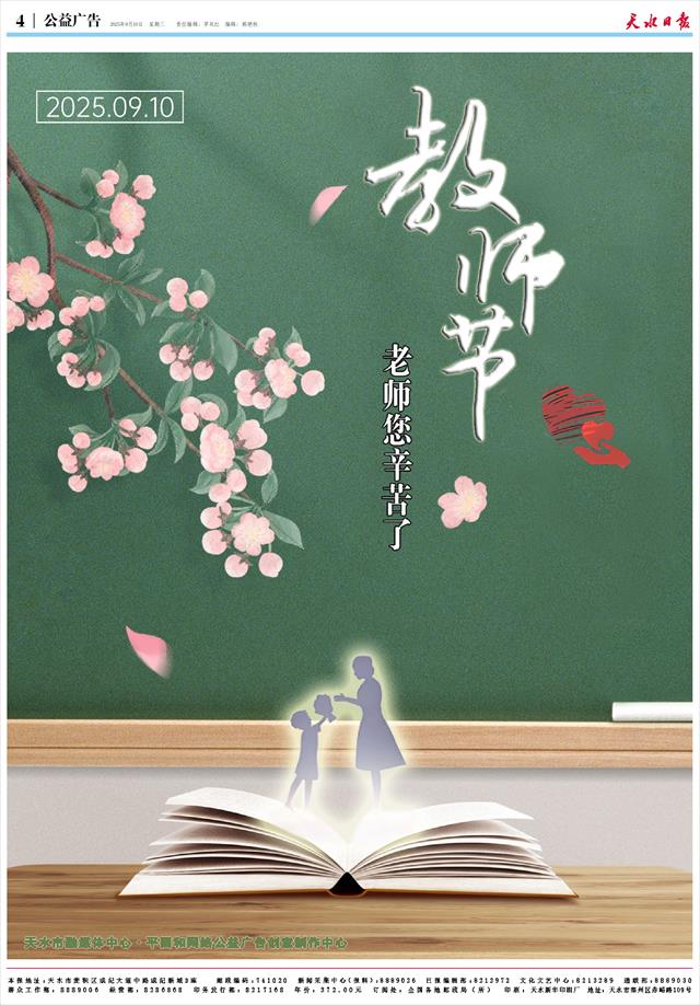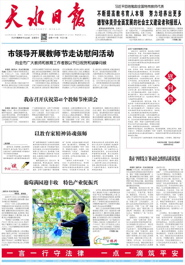 “国将兴,必贵师而重傅。”天水是一片文脉深厚的沃土,素有尊师重教、崇智尚学的优良传统。让教师成为最受社会尊重和令人羡慕的职业,不仅需要节日的礼赞,更需要社会的认同、制度的保障。要坚持以人民为中心发展教育,改善教师待遇,关心教师成长,维护教师权益,支持教师发展,为广大教师安心从教创造更好条件,在全社会营造尊师重教的浓厚氛围。要大力选树优秀教师典型、树立师德楷模,引导广大教师坚定理想信念、陶冶道德情操、涵养扎实学识、勤修仁爱之心,在教书育人岗位上作出新的更大贡献,推动形成优秀人才竞相从教、广大教师尽展其才、好老师不断涌现的良好局面。