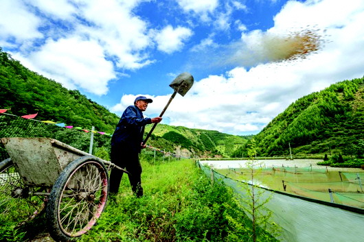 好山出好水,好水养好蟹。日前,笔者走进炬晟蟹养殖农民专业合作社养殖基地,蟹塘水面波光粼粼,养殖人员正在投放饲料,给螃蟹进行“加餐”育肥。