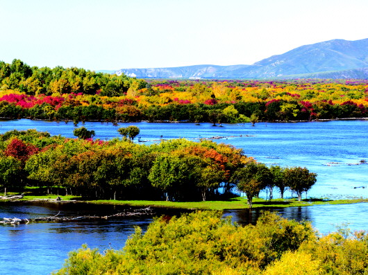 时下,内蒙古额尔古纳湿地迎来秋日盛景,多彩的灌木丛点缀其间,蜿蜒的河流如蓝丝带般静静流淌,宛若大自然打翻的调色盘。 新华社记者 马金瑞 摄