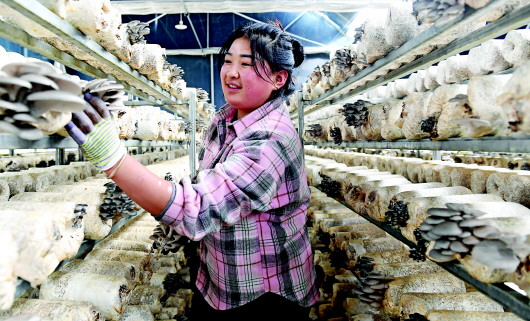 9月18日,清水县白沙镇赵沟村食用菌标准化种植基地内,工作人员在采摘平菇和木耳。