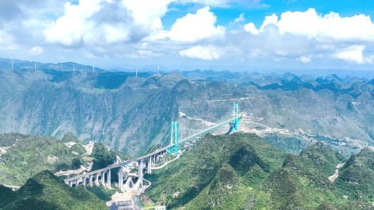 9月28日,世界第一高桥——贵州花江峡谷大桥建成通车。花江峡谷大桥是贵州六枝至安龙高速公路的控制性工程,大桥全长2890米,主跨径1420米,是目前世界山区峡谷第一大跨度钢桁梁悬索桥;其桥面距水面垂直高度625米,是新的世界第一高桥。 新华社记者 刘续 摄