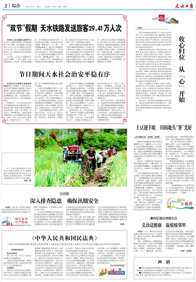 本报讯【天水融媒记者裴婷婷 张雷】国庆中秋假期,天水公安机关全力以赴开展道路交通管理、街面巡逻管控、景区秩序维护等安保工作,全市社会治安大局持续平稳,刑事、治安警情同比下降,人员密集场所、旅游景区秩序井然,辖区道路通行顺畅。
