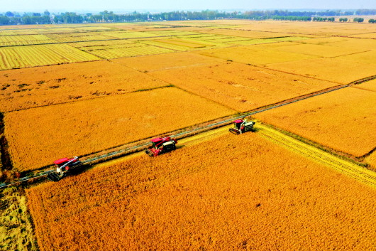 10月14日,在吉林省公主岭市,吉林省米兜种植农民专业合作社进行机械化收割水稻作业展示(无人机照片)。