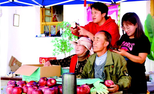 在清水县郭川镇黄大村,农户与助农主播通过直播带货的形式,推广当地优质苹果。