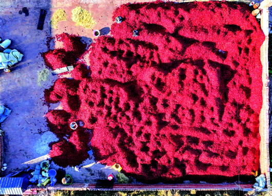 10月19日,在通辽市开鲁县东风镇六合堂村,村民在分拣红干椒(无人机照片)。近日,内蒙古通辽市开鲁县迎来红干椒收获季。开鲁县享有“中国红干椒之都”之美誉,当地的红干椒皮红肉厚、品质优良,畅销国内外市场,近年来全县红干椒种植面积稳定在60万亩。 新华社记者 连振 摄