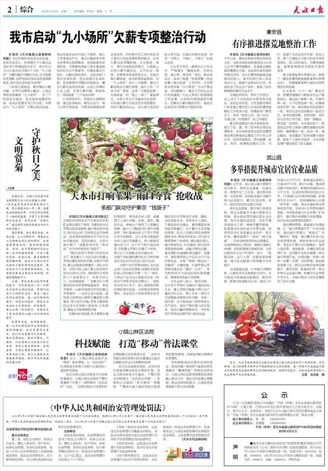 本报讯【天水融媒记者裴婷婷 张雷】为切实维护劳动者合法权益,杜绝非法用工,持续提升中小微企业劳动用工管理规范化水平,我市自10月15日起启动为期1个月的“九小场所”欠薪问题专项整治行动,全力构建权责清晰、监管有效的劳动者权益保障体系,筑牢劳动者权益“防护网”。