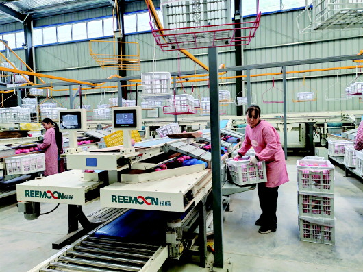 天水易天果业有限责任公司工人在智能分选线上分拣苹果