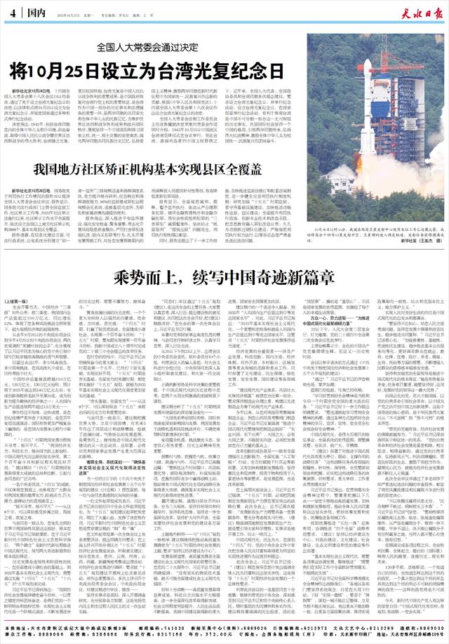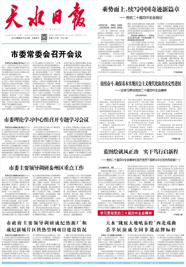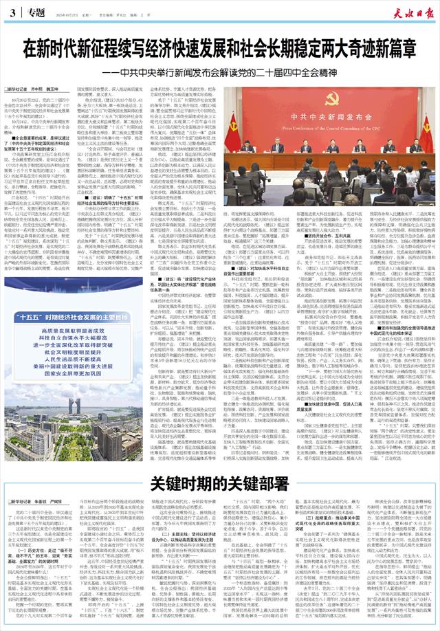 刚刚胜利闭幕的党的二十届四中全会,审议通过了《中共中央关于制定国民经济和社会发展第十五个五年规划的建议》,对未来五年发展作出顶层设计和战略擘画。习近平总书记在全会上的重要讲话和全会通过的《建议》,在全市党员干部群众中引发热烈反响。大家一致表示,要深入学习好贯彻好全会精神,以担当实干、奋楫争先的昂扬姿态,一步一个脚印把宏伟蓝图变为美好现实,为奋力谱写中国式现代化天水篇章贡献力量。