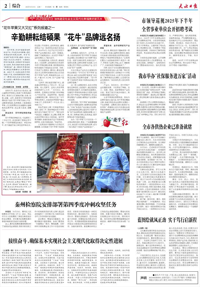 本报讯【天水融媒记者马放】10月24日,市委主要领导在秦州区调研时强调,要深入学习贯彻党的二十届四中全会精神和习近平总书记视察甘肃重要讲话重要指示精神,坚定信心、奋勇争先,凝心聚力强产业、惠民生、促发展,全力冲刺确保“十四五”圆满收官,科学谋划实现“十五五”良好开局。