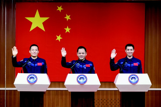10月30日,神舟二十一号载人飞行任务航天员张陆(中)、武飞(右)、张洪章在酒泉卫星发射中心问天阁与媒体记者集体见面。