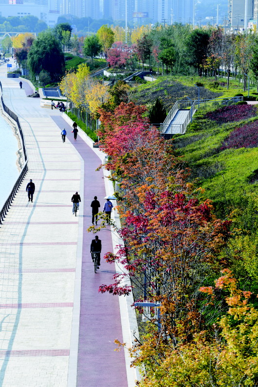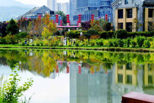 藉河两岸,秋水让天空滤成净透,浮光跃动金辉,水花诉说缱绻,倒映着天边的云彩和斑斓的树木,偶尔有鸟儿轻盈地掠过水面,泛起一圈圈涟漪,为这片宁静的风景增添了生机与活力。