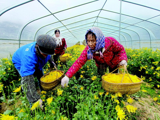 初冬时节,秦州区牡丹镇草川村天水兴华荣生态农业发展有限公司种植的金丝皇菊迎来丰收季,村民们正忙着采摘、装筐。