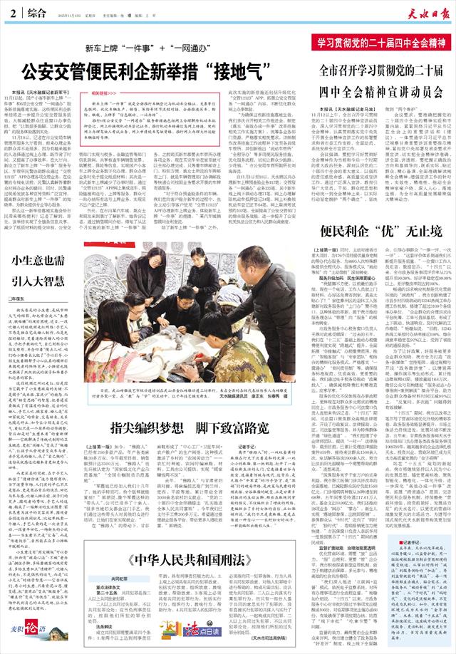 新车上牌“一件事”+“一网通办” 公安交管便民利企新举措“接地气”   本报讯【天水融媒记者蔚军平】11月1日起,国产小客车新车上牌“一件事”和6项公安交管“一网通办”服务新措施落地实施,这些便民利企新举措将进一步提升公安交管服务质效,大幅减轻群众往返窗口办事负担,把“让数据多跑腿,让群众少跑路”的服务体验落到实处。