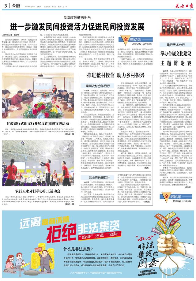 农行天水分行举办职工运动会   为进一步深化员工关心关爱“五项行动”,丰富职工精神文化生活,农行天水分行近日举办了2025年职工运动会,来自市分行机关和辖内7家支行的8支代表队共340余名运动员参加。运动会的成功举办增进了团队凝聚力,激发了拼搏精神和竞争意识,为天水农行企业文化建设注入鲜活动力。                                 缑海兵 摄
