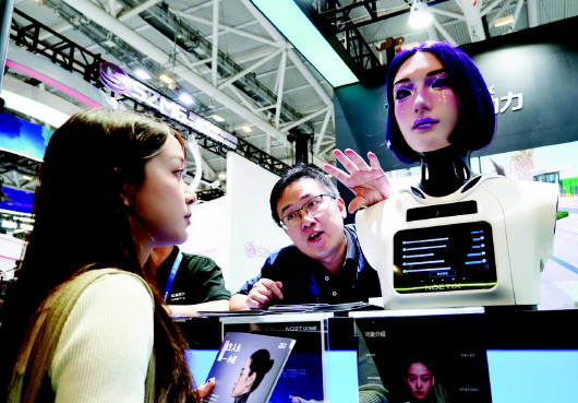 11月16日,观众在第二十七届中国国际高新技术成果交易会上了解可模仿复杂表情的仿生机器人。
