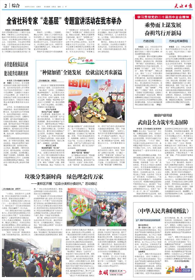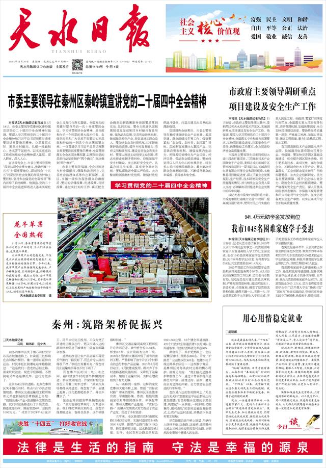 市委主要领导在秦州区秦岭镇宣讲党的二十届四中全会精神   本报讯【天水融媒记者马放】11月18日,市委主要领导在秦州区秦岭镇宣讲党的二十届四中全会精神时强调,要深入学习贯彻党的二十届四中全会精神和习近平总书记视察甘肃重要讲话重要指示精神,立足基层实际,聚焦乡村振兴,扎根一线践初心、务实苦干显担当,以实实在在的工作成效推动全会精神深入基层、深入群众、深入人心。