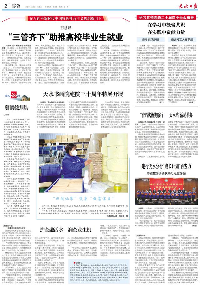 “高中生成长计划”奖学金公益项目由中国建设银行发起,旨在为家境困难、成绩优异的高中生提供经济资助,助力他们专注学业、逐梦大学。该项目自2007年启动以来,18年来已经在全国多个学校实施,持续为怀揣梦想的学子播种希望。未来,建行天水分行将继续坚守“金融为民”初心,持续深化公益行动,以金融之力助力梦想,为促进地方教育高质量发展、服务乡村全面振兴持续贡献建行力量。 (宋超)