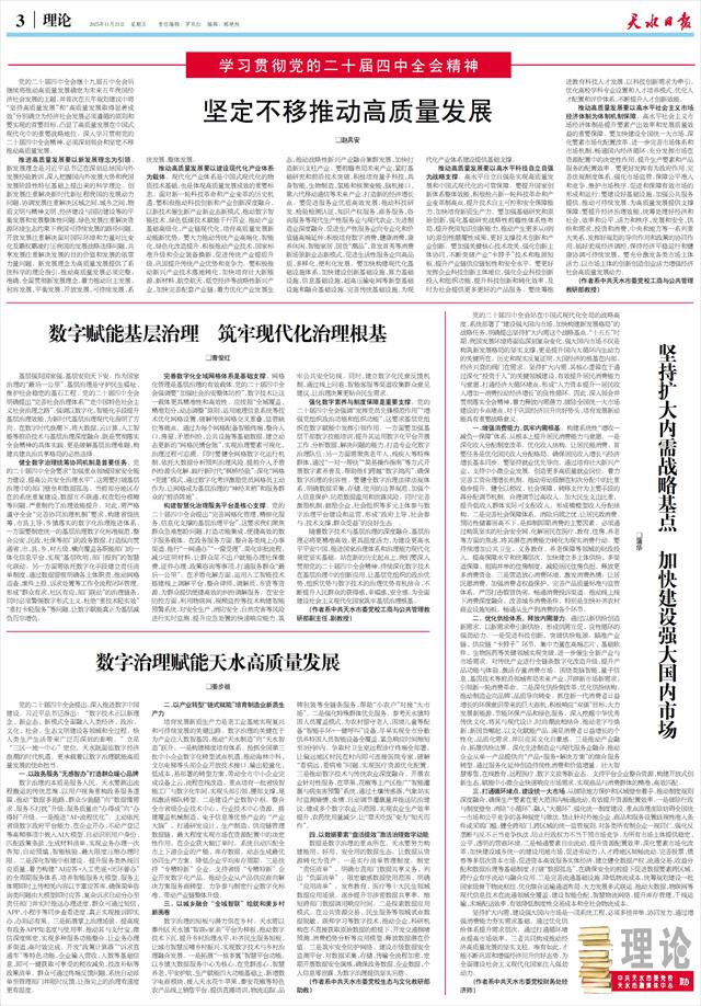党的二十届四中全会提出,深入推进数字中国建设。习近平总书记指出:“数字技术正以新理念、新业态、新模式全面融入人类经济、政治、文化、社会、生态文明建设各领域和全过程,给人类生产生活带来广泛而深刻的影响。”立足“三区一地一中心”定位,天水既面临数字经济浪潮的时代机遇,更承载着以数字治理赋能高质量发展的使命担当。