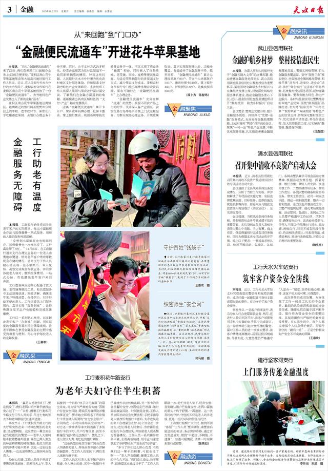 从“来回跑”到“门口办” “金融便民流通车”开进花牛苹果基地   本报讯 “自从‘金融便民流通车’来了以后,我们在果园门口就能办业务,比以前方便多啦。”麦积区南山花牛苹果基地果农张大姐高兴地对银行工作人员说。近日,在人民银行天水市分行的大力指导下,麦积农村合作银行在麦积区南山花牛苹果基地投放了一台“金融便民流通车”,为当地特色产业发展注入了新的金融“活水”。