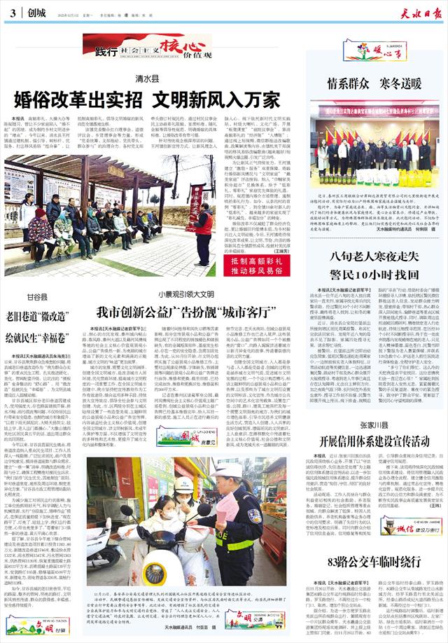 本报讯【天水融媒记者蔚军平】清水县一位年近八旬的老人独自离家后一直未归,家属寻找无果后向民警求助。经过警民10个小时不间断搜寻,最终将老人找到,让初冬的寒意里温情满溢。