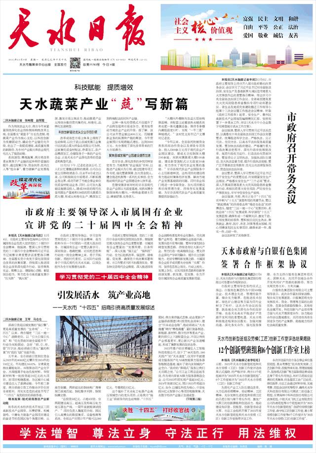 市政府主要领导指出,学习宣传贯彻党的二十届四中全会精神,是当前和今后一个时期的一项重大政治任务。市属国有企业一定要认真学习、深刻领会、准确把握,切实把思想和行动统一到全会精神上来,勇于开拓创新、勇担时代重任,以实际行动投身于中国式现代化天水实践,以国企担当为全市发展增光添彩。