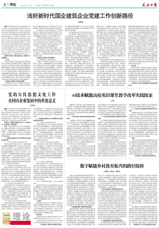数字赋能乡村教育振兴的路径探析 □左峻赫 徐义新 庞莞祺   在数字技术深度渗透教育领域的背景下,数字赋能成为破解乡村教育发展瓶颈、推动乡村教育振兴的关键抓手。乡村教育作为乡村振兴的重要基石,肩负着培养新型农民、传承乡村文化、促进城乡融合的重要使命。长期以来,我国乡村教育受地理区位、经济条件等因素制约,面临教育资源短缺、教学质量不高、人才流失严重等突出问题,难以满足乡村振兴对高素质人才的需求。随着数字技术快速发展,教育数字化转型成为必然趋势,为乡村教育突破困境提供了新机遇。数字赋能乡村教育,通过将大数据、人工智能、互联网等数字技术与乡村教育教学、管理各环节深度融合,可打破时空限制,优化资源配置,创新教学模式,提升治理效能,为乡村教育振兴注入强劲动力。因此,深入探析其实现路径,具有重要的现实意义与理论价值。