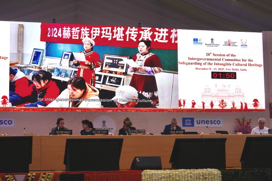 12月11日,在印度新德里举行的联合国教科文组织保护非物质文化遗产政府间委员会第20届常会上,大屏幕上播放中国“赫哲族伊玛堪”保护成果。