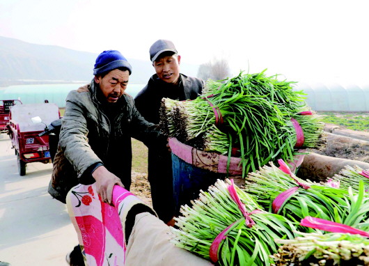 近日,武山县山丹镇贺店村的蔬菜种植园区内绿意盎然、生机勃勃。武山韭菜迎来头茬采收季,农户们正忙着收割、捆扎、装车,一派热火朝天的丰收景象。