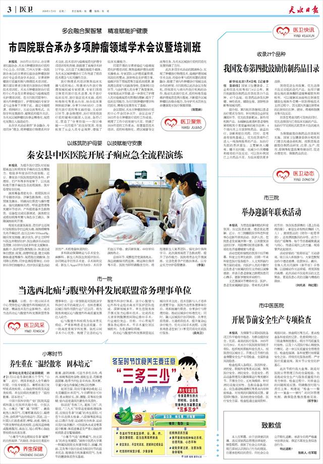 市中医医院 开展节前安全生产专项检查   本报讯 为保障节日期间医院各项工作平稳有序推进,为群众提供安全、优质、高效的医疗服务,2025年12月29日,天水市中医医院领导班子带队,组织相关职能科室负责人,按照责任区域分工,开展元旦节前行政查房暨安全生产专项检查,全面排查风险隐患。