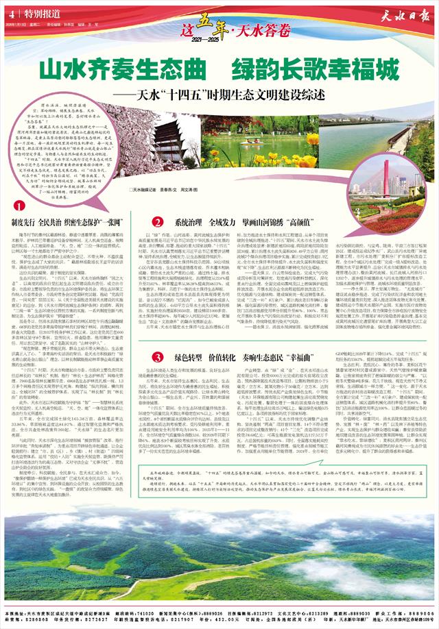 “十四五”时期,天水市深入践行习近平生态文明思想和习近平总书记视察甘肃重要讲话重要指示精神,坚定不移走生态优先、绿色发展之路,以“功在当代、利在千秋”的担当高位谋划,以“精准施策、久久为功”的韧劲全领域攻坚,统筹山水林田湖草沙一体化保护和系统治理,绘就了一幅山河锦绣、绿富同兴的壮美画卷。