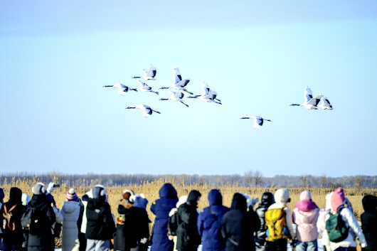 1月21日,游客在黑龙江扎龙国家级自然保护区内观看丹顶鹤。
