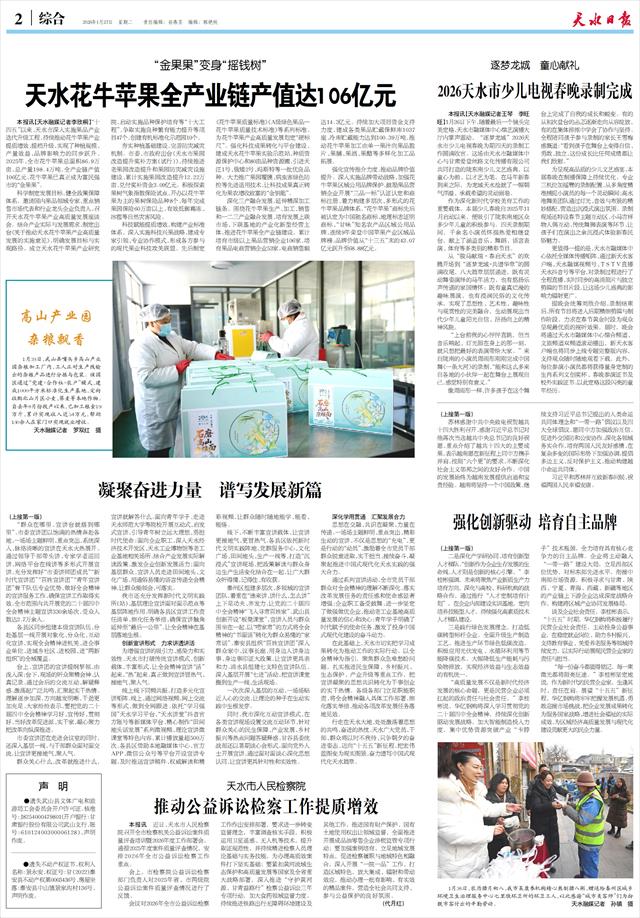 本报讯【天水融媒记者王琴 李旺旺】1月26日下午,随着最后一个镜头完美定格,天水市融媒体中心综艺演播大厅内掌声雷动,“逐梦龙城”2026天水市少儿电视春晚为期四天的录制工作圆满收官。这场由天水市融媒体中心与甘肃爱登丝路文化传播有限公司共同打造的陇东南少儿文艺盛典,以童心为韵、以才艺为笔,在马年新春到来之际,为龙城天水绘就了一幅朝气洋溢、承载希望的灵动画卷。
