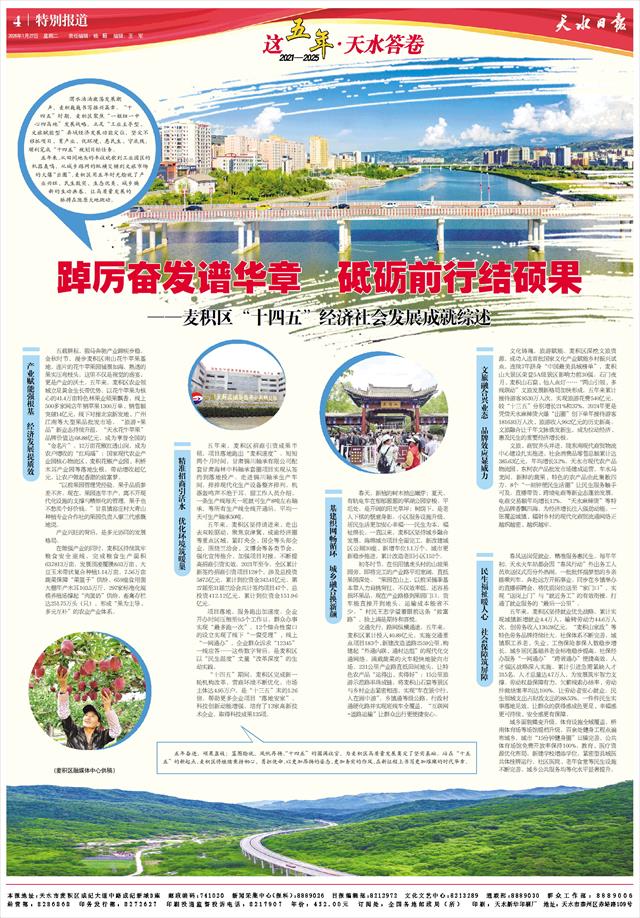 渭水汤汤激荡发展潮声,麦积巍巍书写振兴篇章。“十四五”时期,麦积区聚焦“一枢纽一中心四高地”发展战略,立足“工业主导型、文旅赋能型”县域经济发展功能定位,坚定不移抓项目、育产业、优环境、惠民生、守底线,顺利完成“十四五”规划目标任务。