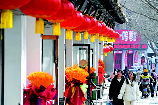 春节临近,秦州区街道上红灯笼高悬、沿街树木被各色绢花装点出春意盎然的景象,天水街头年味渐浓。
