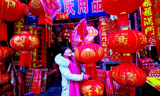1月29日,市民在河南省信阳市光山县公安街市场内选购春节饰品。