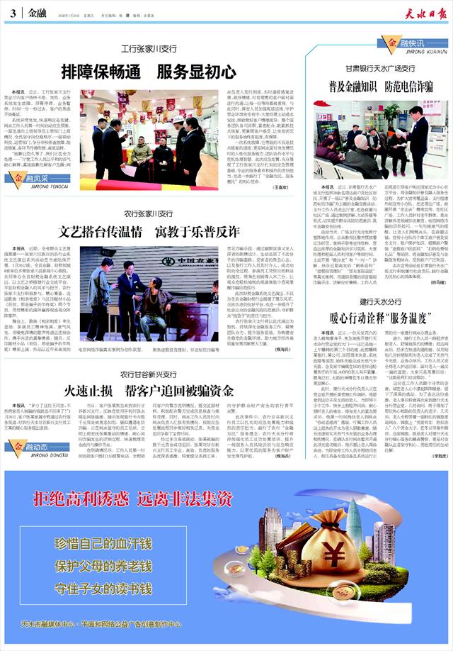 甘肃银行天水广场支行 普及金融知识 防范电信诈骗   本报讯 近日,甘肃银行天水广场支行组织30余名周边商户及社区居民,开展了一场以“普及金融知识 防范电信诈骗”为主题的金融宣教活动。支行工作人员走出厅堂、走进商圈与社区广场,通过案例讲解、互动答疑等形式,切实提升群众风险防范意识,筑牢金融安全防线。