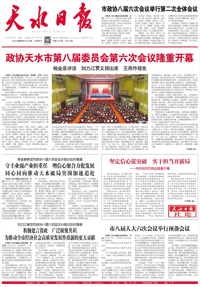 心系发展,情牵民生;汇聚民意,凝聚力量。市两会的召开,对于进一步凝聚全市的智慧和力量,激励广大干部群众乘势而上、砥砺前行,具有十分重要的意义。我们坚信,参加市两会的全体人大代表、政协委员一定能够牢记职责使命,以高度的政治责任感和历史使命感,建睿智之言、献务实之策、谋发展之举,把干部群众的热切期盼转化为加快发展的强劲动能,把社会各界的思想共识凝聚成团结奋进的磅礴力量,共同谱写好中国式现代化天水篇章。