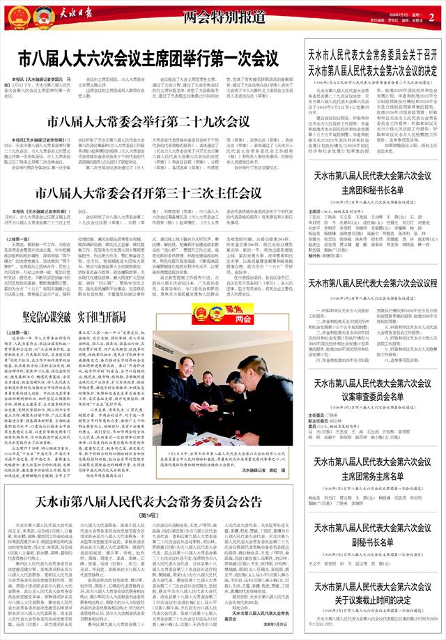 天水市第八届人民代表大会第六次会议议程 (2026年2月1日市八届人大六次会议预备会议通过)   一、听取和审议天水市人民政府工作报告;