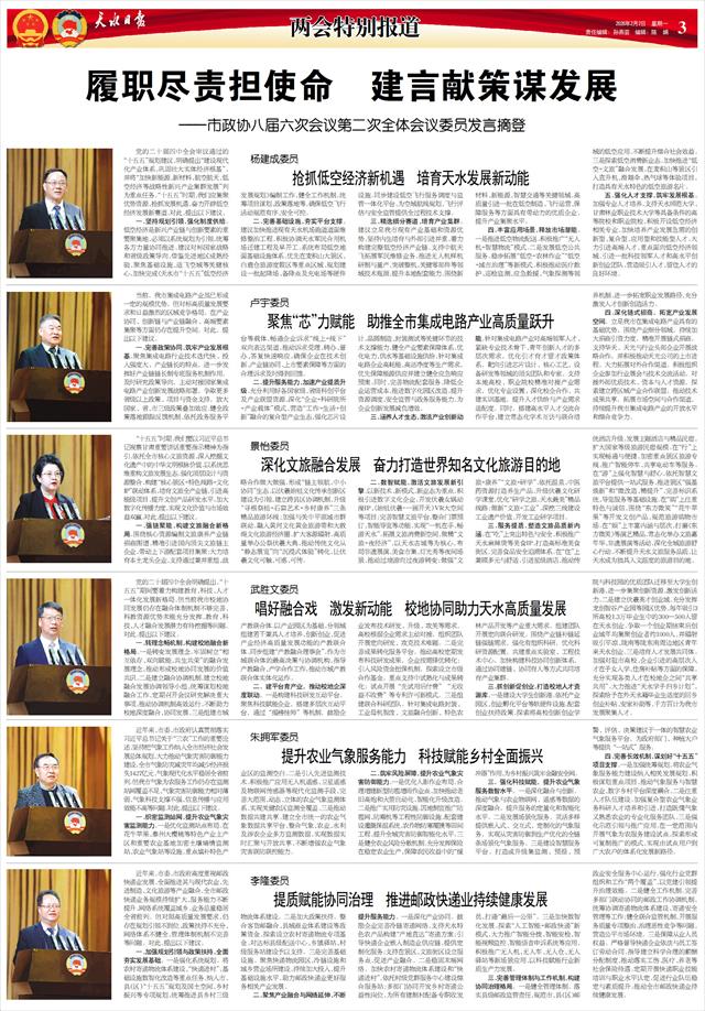 杨建成、卢宇、景怡、武胜文、朱拥军、李隆6位委员先后发言。紧紧围绕开辟低空经济赛道、集成电路产业发展、深化文旅融合、校地协同创新、农业气象服务能力提升、邮政快递体系建设等事关全市经济社会高质量发展的重点领域,结合各自履职实践,提出了十分中肯的意见和建议。