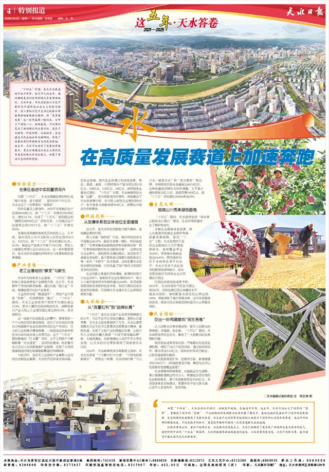 在高质量发展赛道上加速奔跑   “十四五”时期,是天水发展进程中极不寻常、极不平凡的五年。面对错综复杂的宏观环境与多重困难挑战,天水市委、市政府坚持以习近平新时代中国特色社会主义思想为指导,深入贯彻习近平总书记视察甘肃重要讲话重要指示精神,将“高质量发展”这一宏伟蓝图一绘到底。全市上下团结一心、砥砺奋进,不仅顺利完成了规划确定的主要目标,更在产业转型、科技创新、文旅融合、生态建设及民生福祉等关键领域,实现了由量向质的华丽转身与历史性跨越。这五年,天水不仅夯实了发展的厚重基石,更在全面建设社会主义现代化幸福美好新天水的征程上,积蓄了奔涌不息的澎湃势能。